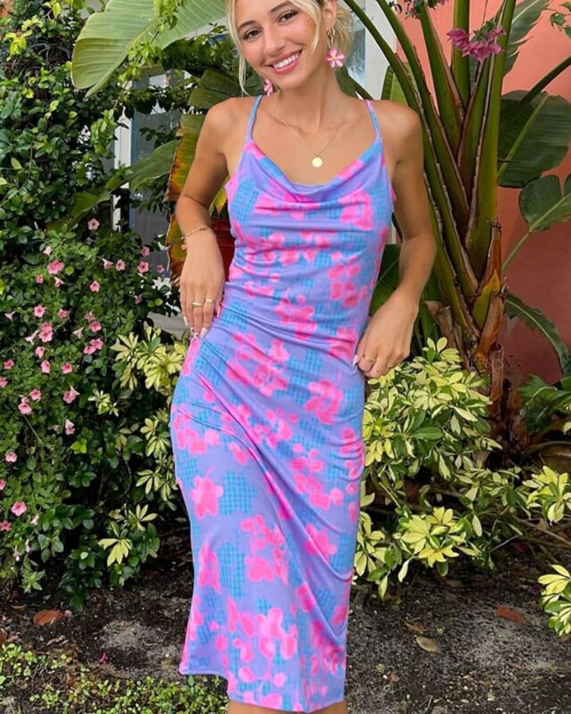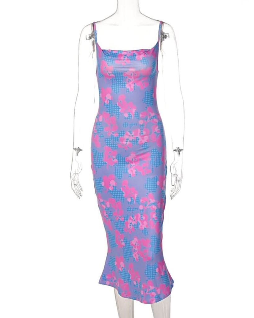 Perfect your daily look with our unique patchwork floral print sleeveless midi purple dress.
