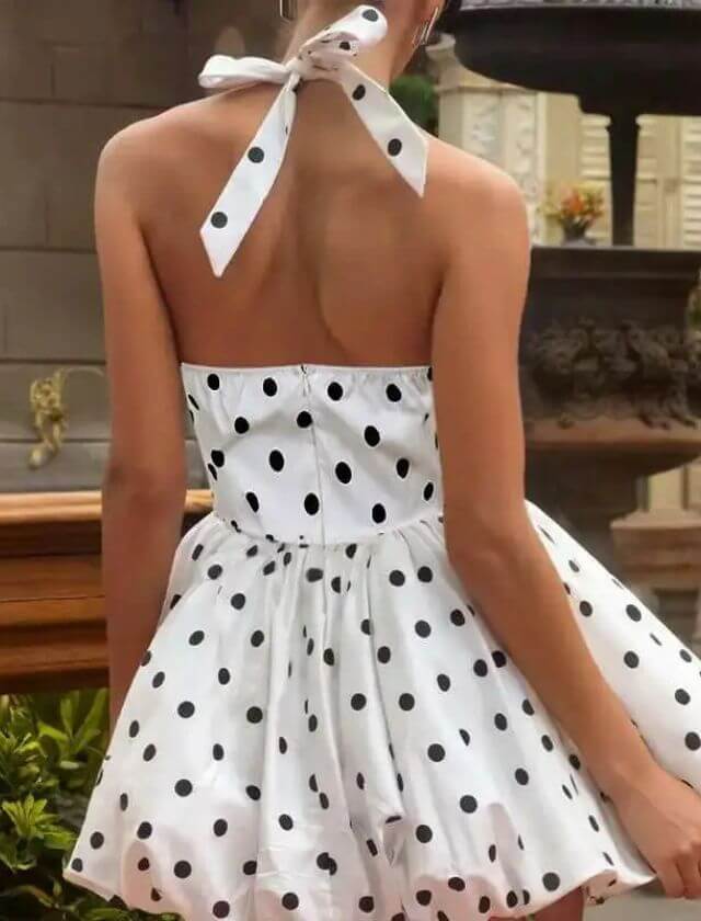 Playful, flirty, and timelessly chic — our Polka Dot Halter Backless White Mini Dress is the ultimate summer showstopper. Featuring a classic polka dot print, halter neckline, and an open back, this mini dress brings vintage charm with a modern twist. The flowy silhouette and lightweight fabric make it perfect for warm days, garden parties, or beachside strolls.