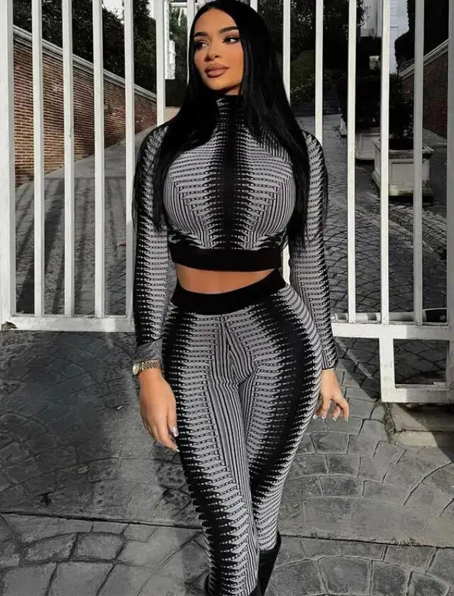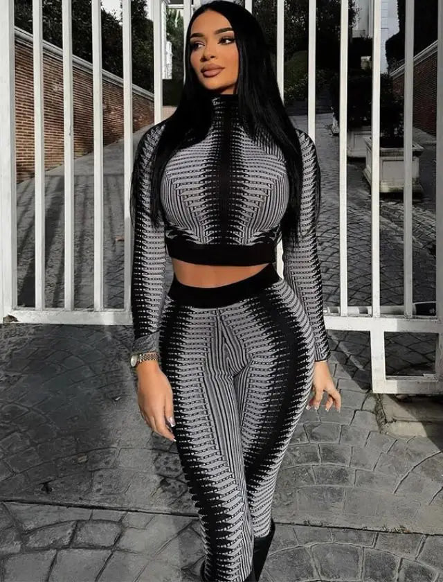 Experience the ultimate combination of style and comfort with our Print Long Sleeve High Neck Crop Top Two Piece Set! Made with soft and lightweight fabric, this set features a trendy print, long sleeves, and a high neck crop top. Be ready to turn heads and make a statement wherever you go in this must-have set.