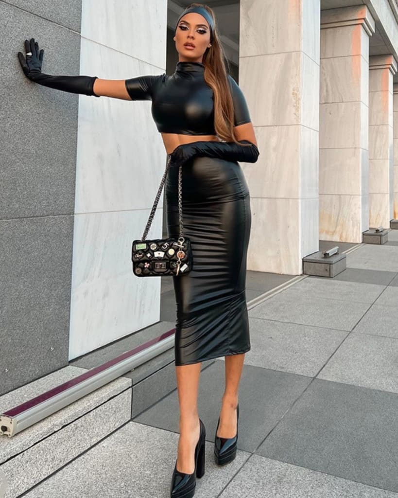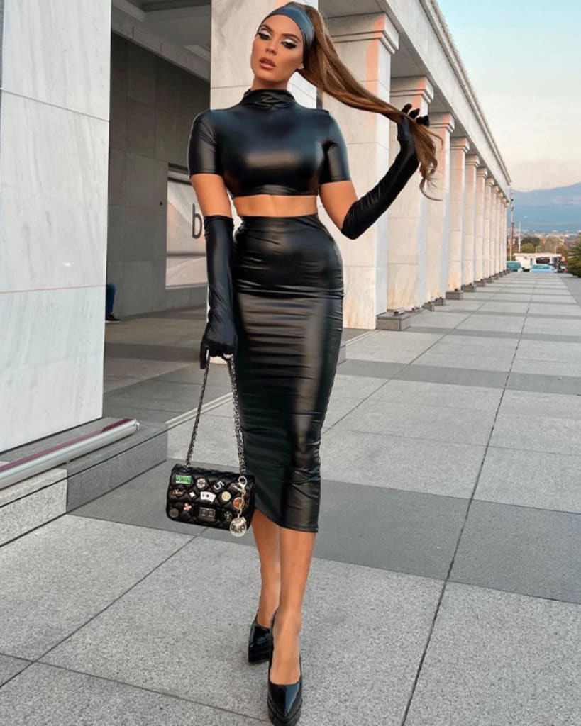 Update your wardrobe with this stylish two piece set featuring a PU faux leather crop top with a short sleeve construction and a matching skirt. Both pieces are finished off with gloves for an added touch. Perfect for any occasion.