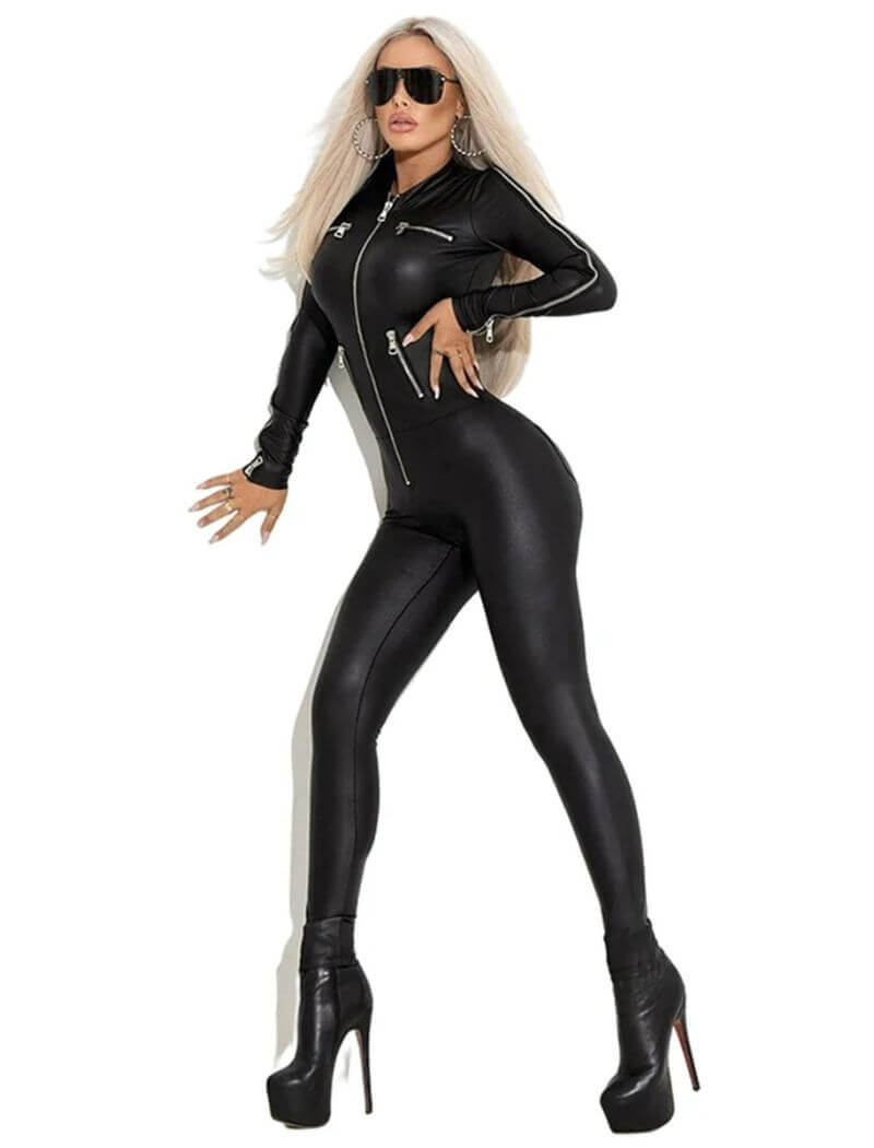 Introducing our PU Leather Bodycon Long Sleeve Jumpsuit, the ultimate chic and stylish outfit for the fashionista in you! Made from high-quality PU leather, this jumpsuit is not only edgy and trendy, but also comfortable and stretchy for all-day wear. The bodycon fit hugs your curves in all the right places, ensuring you look and feel confident wherever you go.
