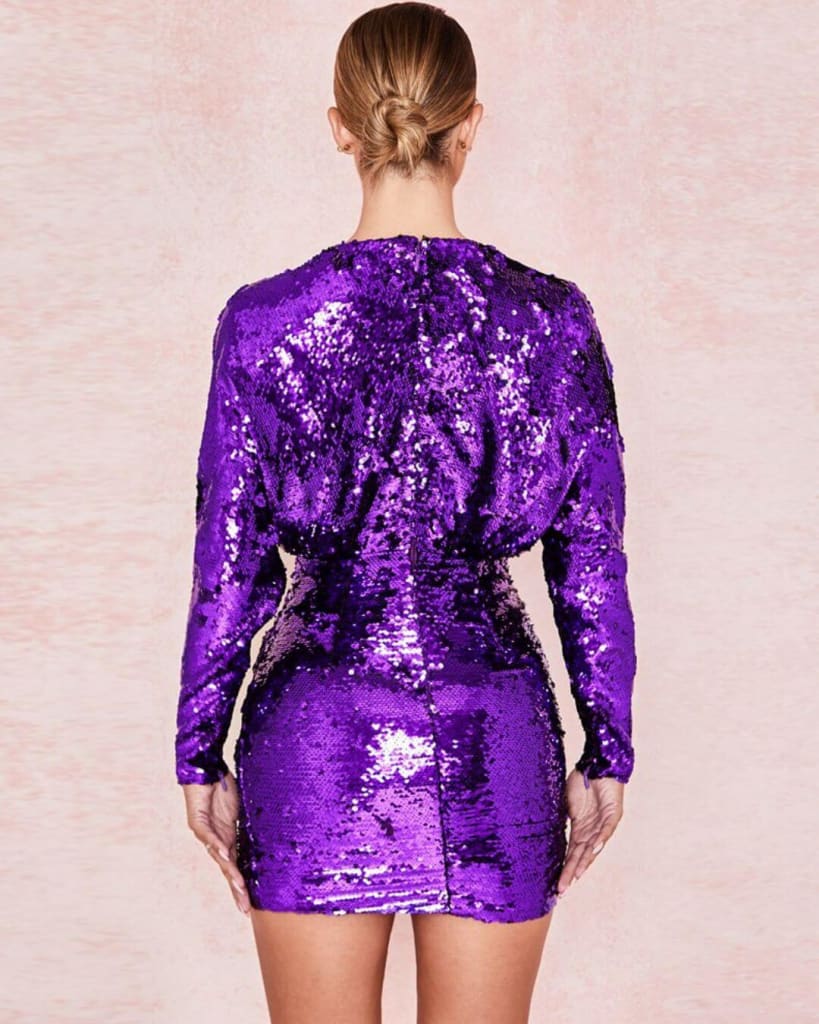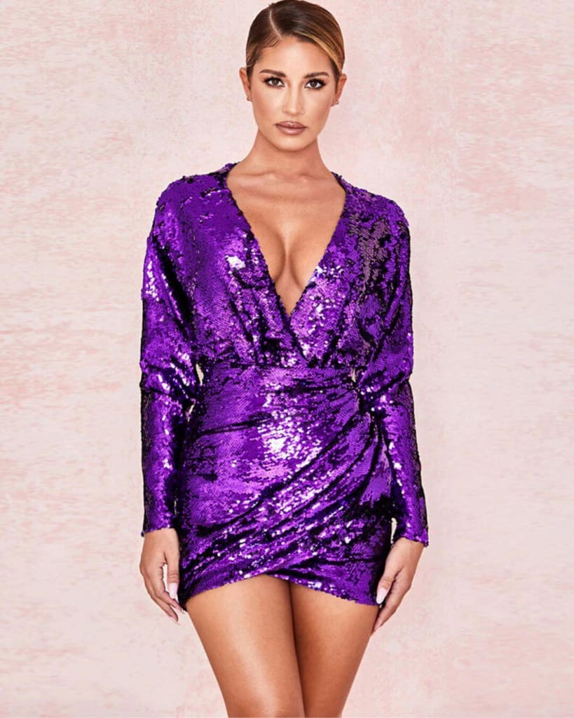 Dress to impress with our latest purple sequin deep v-neck evening sexy purple mini dress. Perfect to wear to your next event!