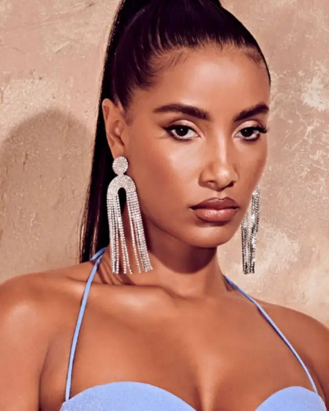 Give your look a final touch with our unique rhinestone fringe drop earrings.