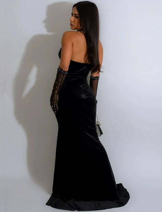 Rhinestones Corset Velvet Slit Long Dress
