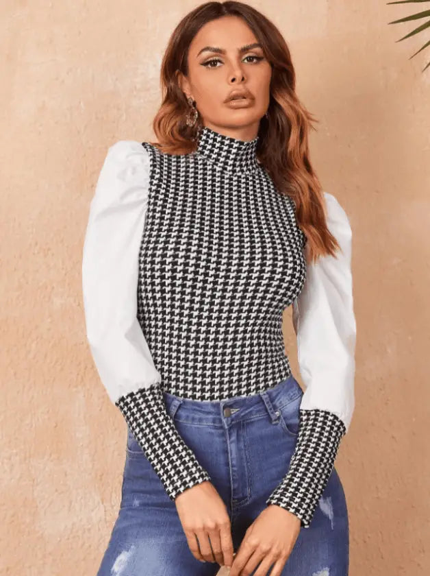 Round Neck Houndstooth Print Top