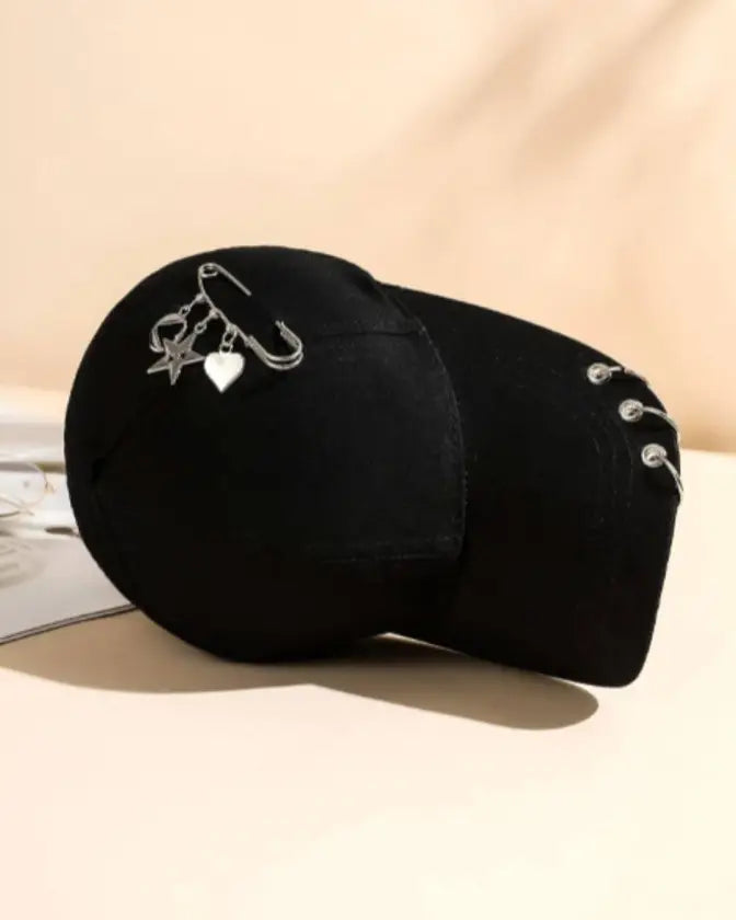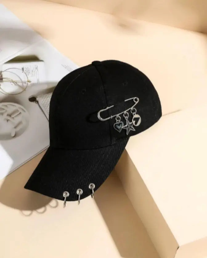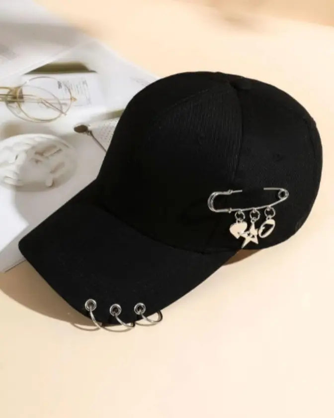 Complete your look with our fashion safety pin and ring decor baseball black hat.