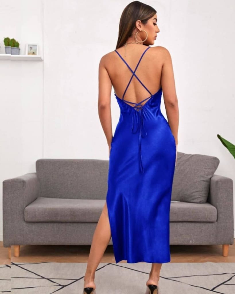 Define your style statement ladies, with our on-trend satin crisscross back high split midi blue dress.