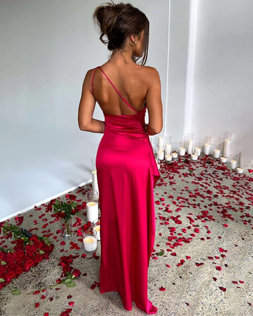 Satin One Shoulder Midi Elegant Ruched Slit Dress is designed to make a statement at any event. This prom dress features a side slit, sleeveless design, and is available in red and gold for added glamour. The soft satin fabric is long-lasting and comfortable to wear, making it an ideal cocktail dress for any occasion.