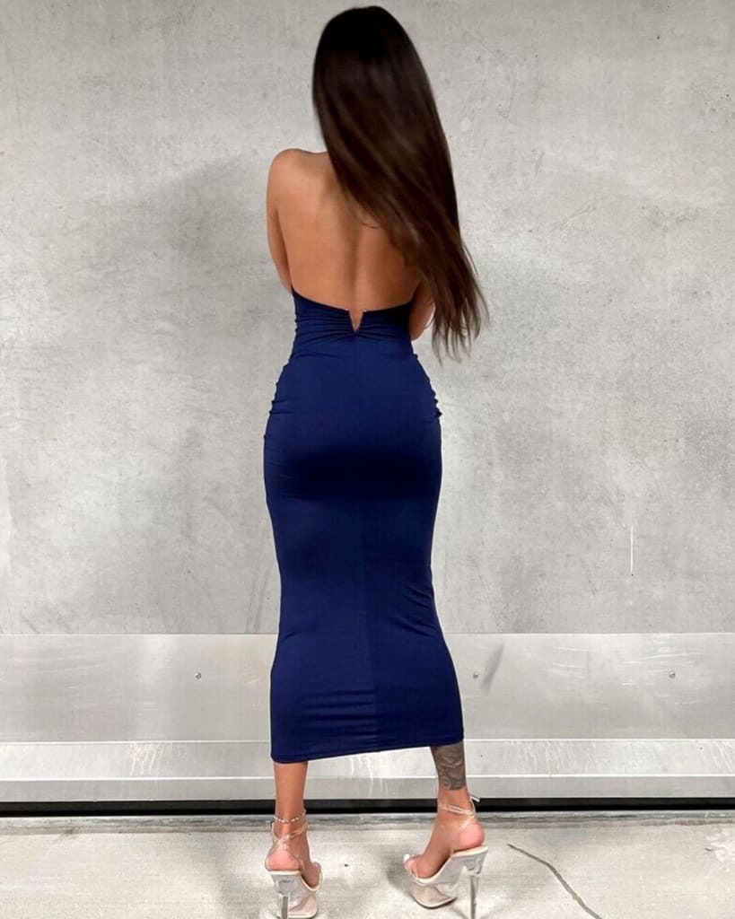 Flaunt this stylish and trendy backless blue o-neck midi dress for upcoming events and look effortlessly stylish wherever you go. It is elegant.