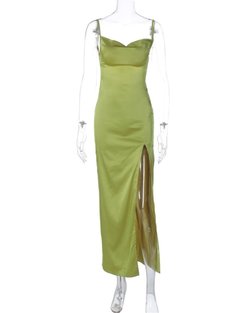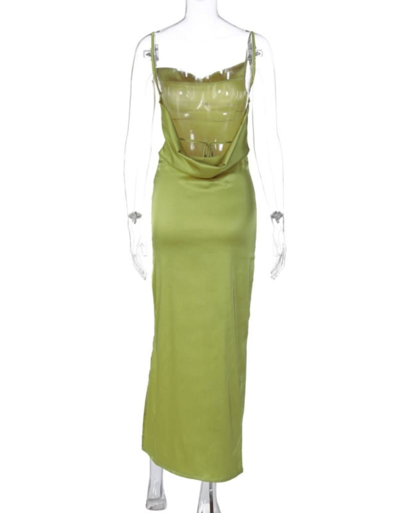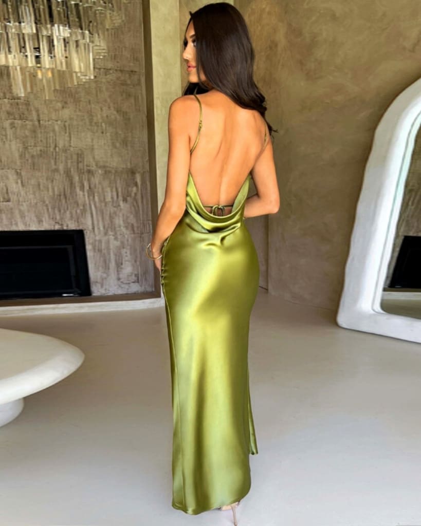 This classic satin dress features a lace-up detail and a ruched backless design. Its long slit along the side provides additional ease of movement, while the luxurious satin fabric is sure to ensure a comfortable fit. Dress up any occasion in this timeless classic.