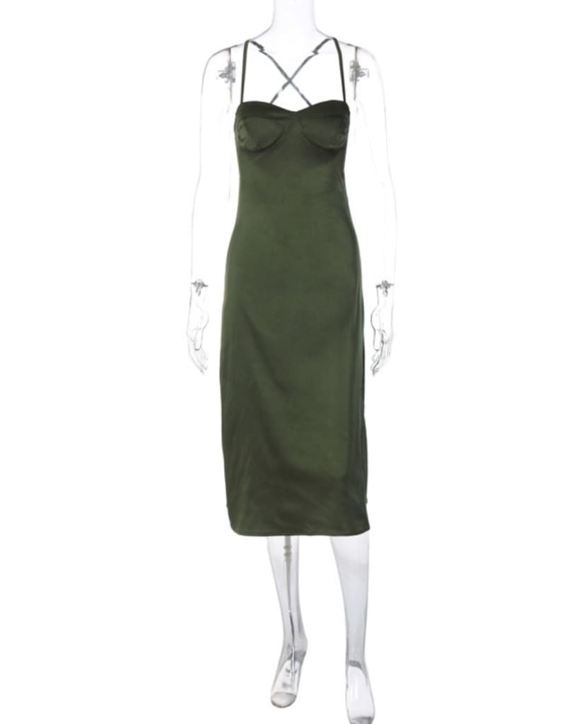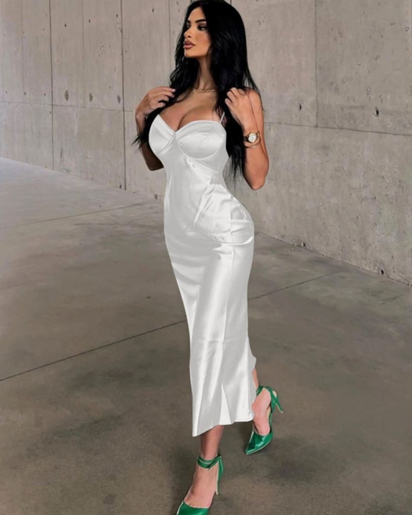 This sleek dress is the epitome of elegance. Crafted from satin with a lace-up corset design, it offers a classic silhouette with a subtly modern twist. The fitted body-con fit creates a flattering silhouette, perfect for any formal occasion.