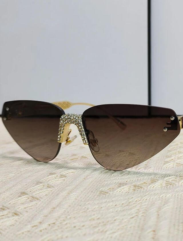 The small, rimless design and cat-eye shape give these sunglasses a trendy and chic look that is sure to elevate your style game. The rhinestone embellishments add a touch of sparkle and glamour, making them the ultimate must-have accessory for the confident and adventurous fashionista.