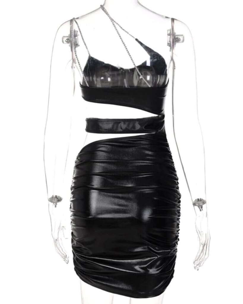 Dress to impress with our latest sexy cut out leather one shoulder mini dress for a glamorous look. Perfect for parties. Shine and stand out at your next party with our latest sexy cut out leather one shoulder mini dress! Wow everyone with your glamorous look and make a statement. Perfect for any occasion, this dress will make you feel confident and irresistible. Don’t miss out on the chance to turn heads and feel amazing.
