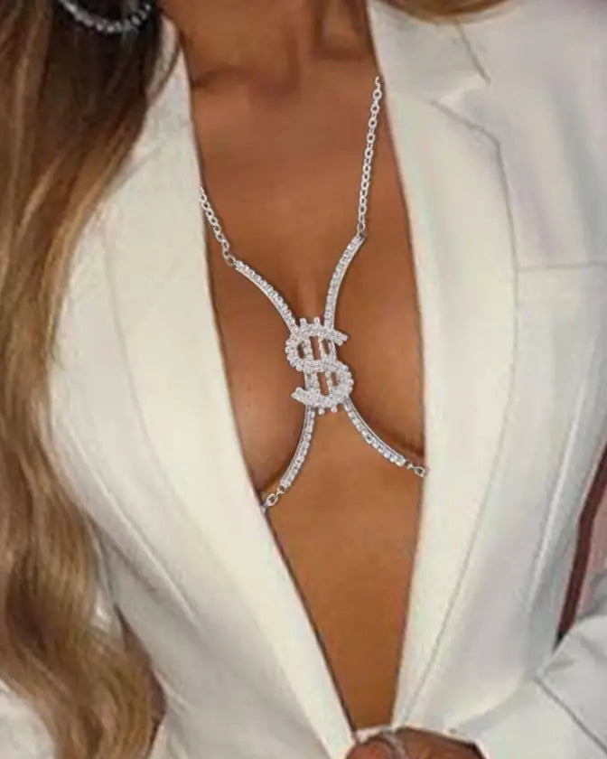 Stand out and look hot at your next party with our sexy dollar rhinestone bra chest chain.