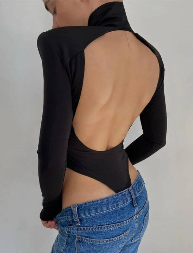 With a high neckline and long sleeves, this bodysuit exudes elegance and sophistication, but the backless design adds a touch of daring and sexiness. It’s the perfect blend of chic and sultry, making it an ideal choice for any party or special occasion. And the stretch fabric ensures a comfortable and flattering fit, allowing you to move and dance with ease.