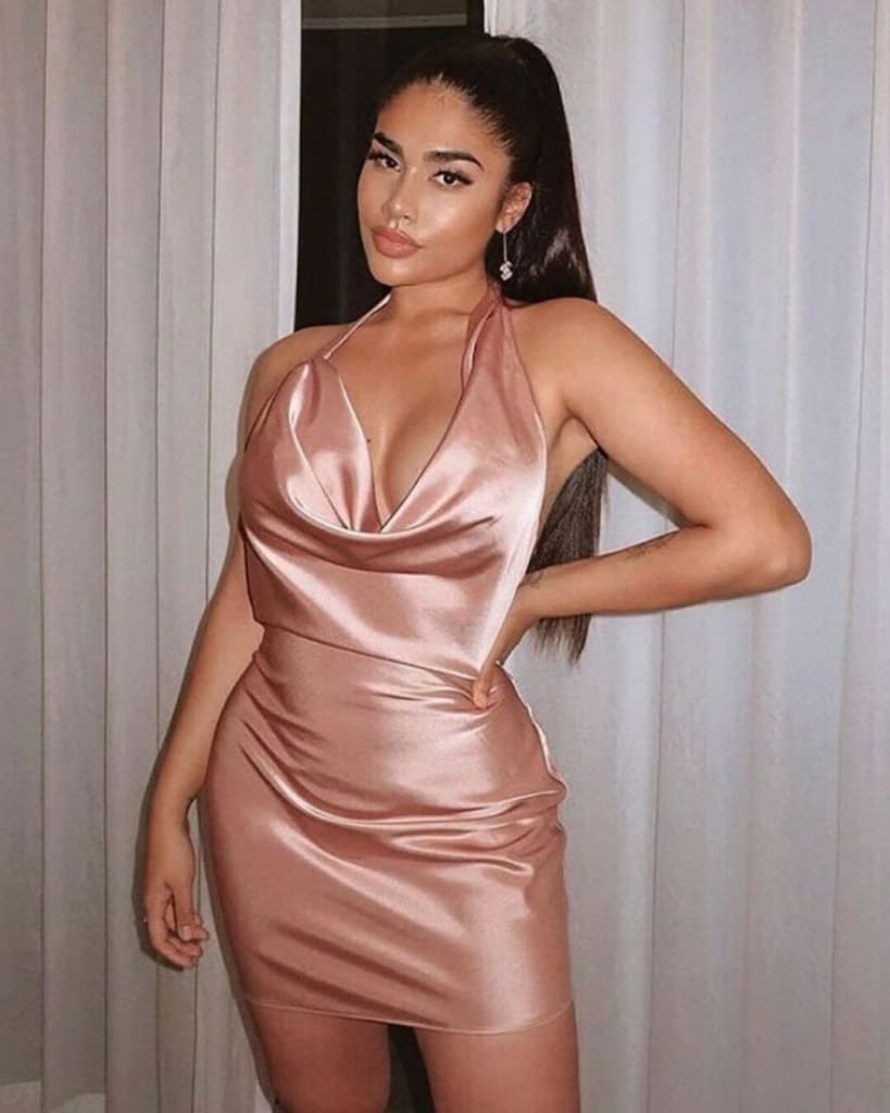 Crafted with a luxurious satin fabric, this bodycon mini dress hugs your curves in all the right places, while the high waist design accentuates your figure. The sleeveless, v-neck cut adds a touch of allure and sophistication, making it the perfect choice for cocktail parties, summer soirées, and any occasion where you want to make a statement.