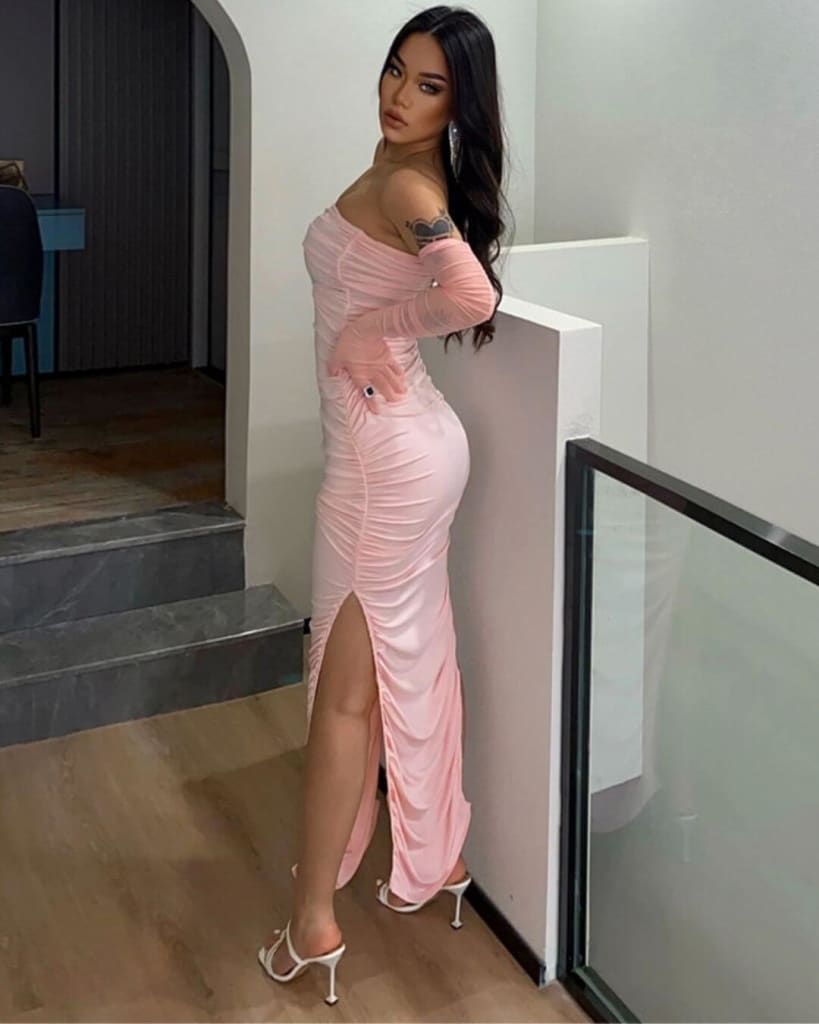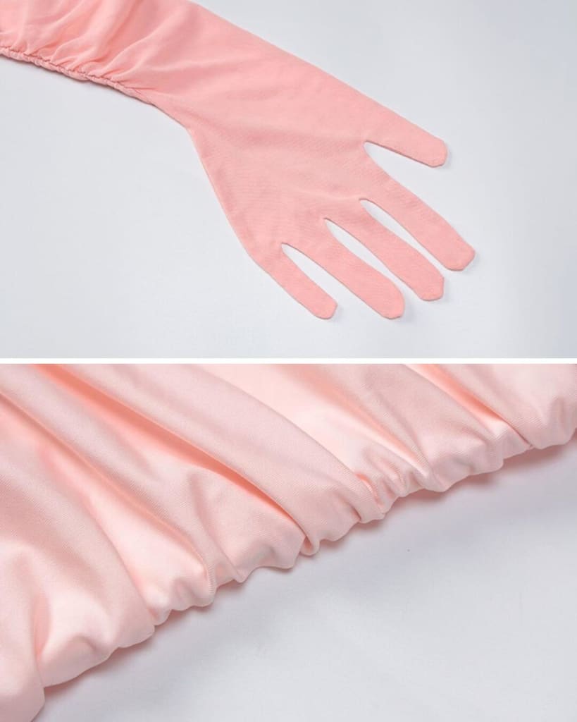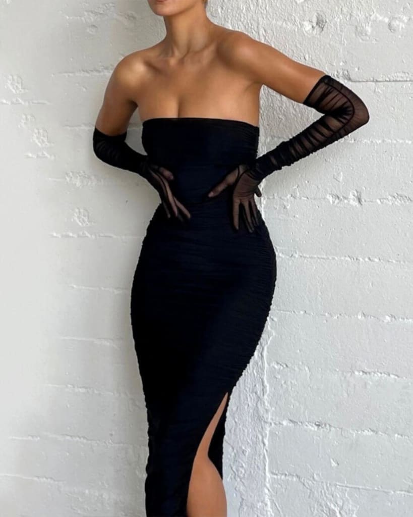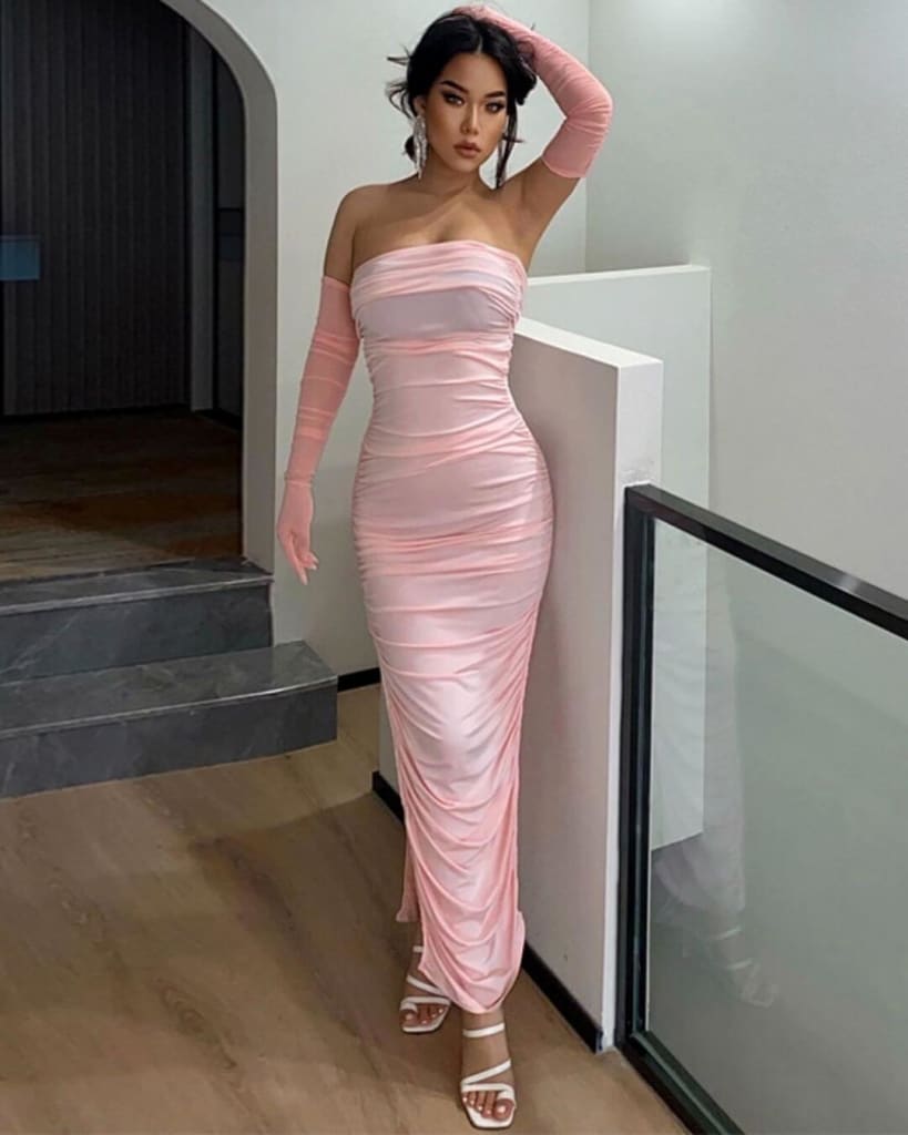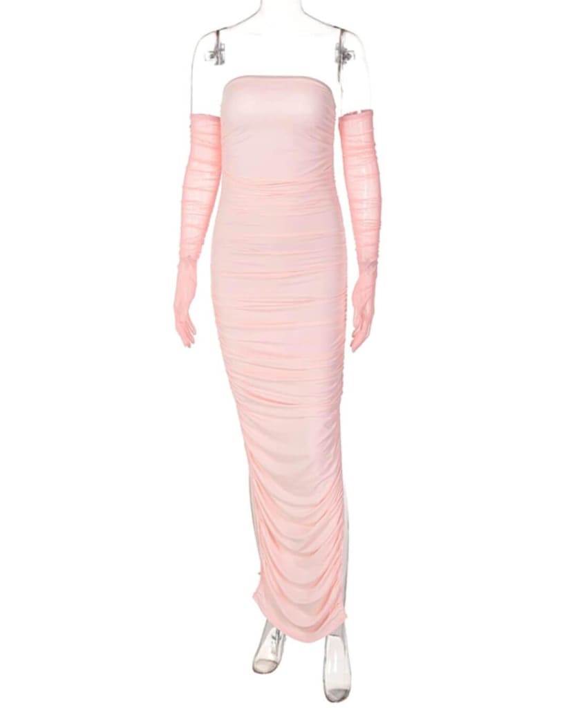 Make a style statement with ultra-chic party ruched mesh long gloves dress.