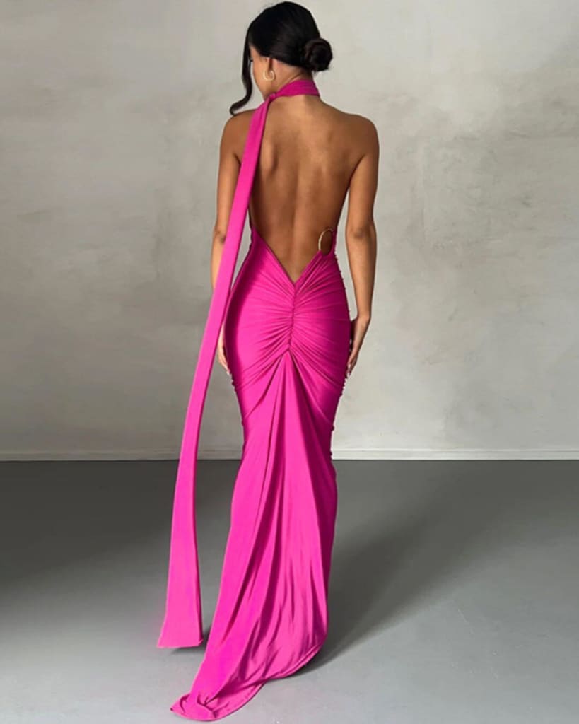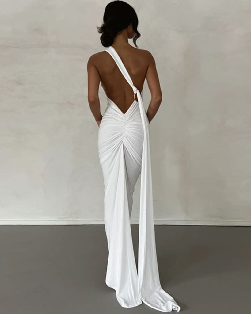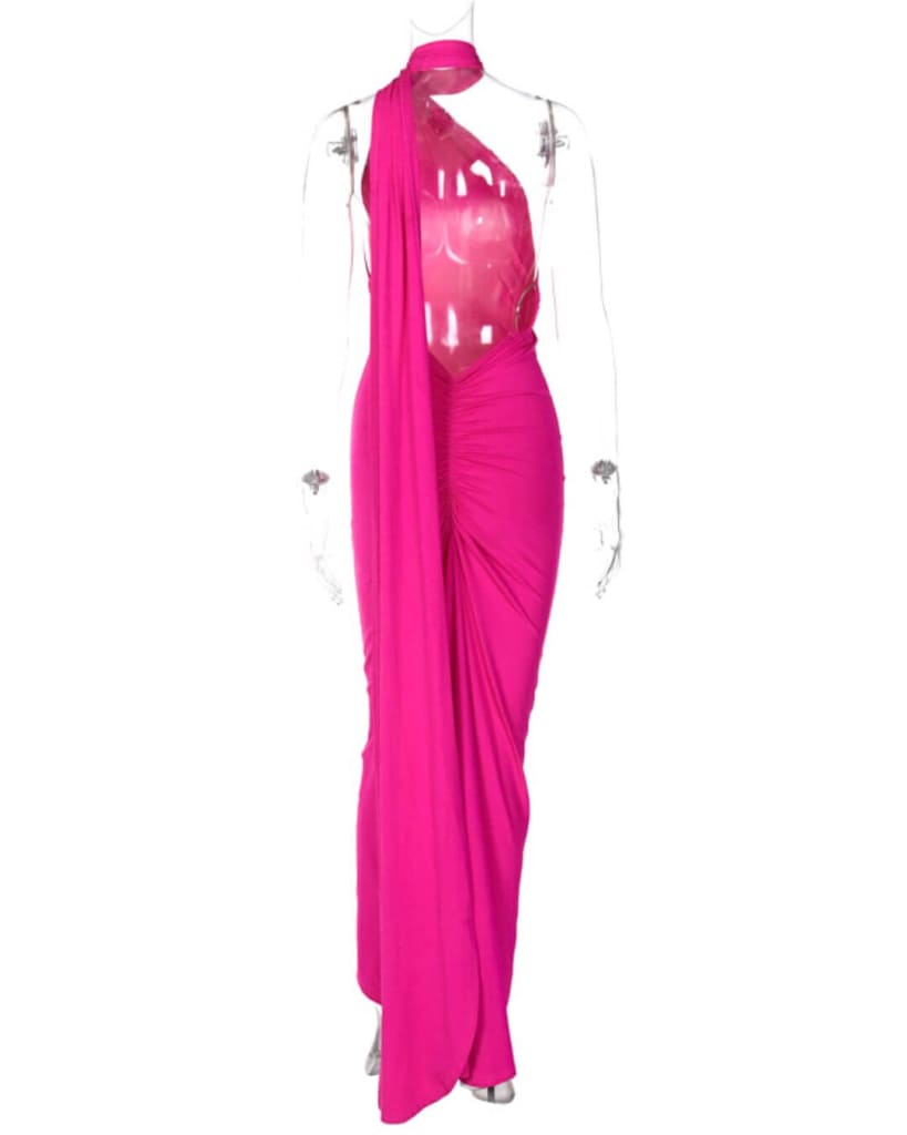 This solid one shoulder halter dress is perfect for special occasions. Featuring a ruched ruffle and backless sleeveless design, it is both elegant and comfortable. Show off your style with the added slit in the skirt for an extra touch of glamour.