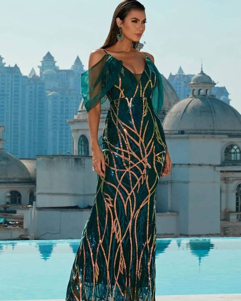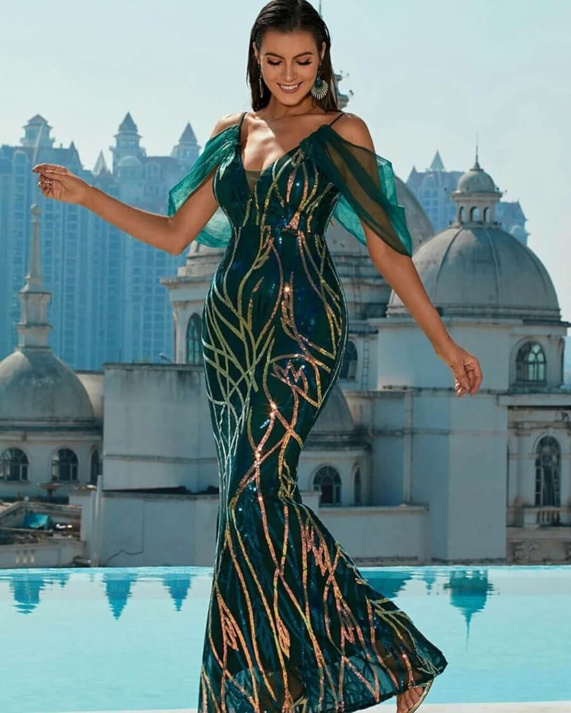 Introducing the Off Shoulder V-Neck Mesh Sleeve Sequin Sexy Maxi Dress, your new partner in crime for those nights when you want to leave a trail of dropped jaws and awe-struck gazes. Crafted for the bold, the beautiful, and the fashionably fearless, this dress from STYLORD Boutique isn’t just a piece of clothing – it’s your ticket to becoming the evening’s main attraction.