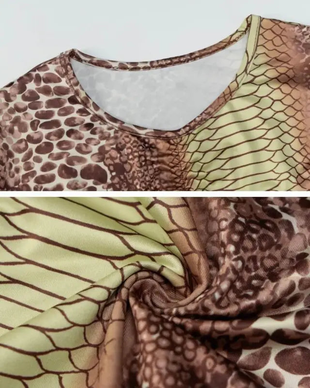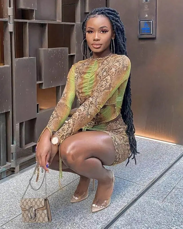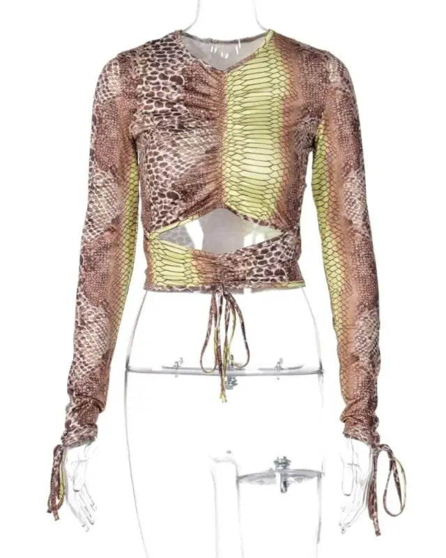 Wrap up in style for the season ahead with our on trend snake print long sleeve drawstring ruched stretch crop top from STYLORD! Level up your fashion game with our must-have snake print crop top! Unleash your bold side and show off your style with a chic ruched design and trendy drawstring feature. Perfect for any season, this top is made with high-quality stretch material that will keep you comfortable and confident all day long. Be ready to stand out from the crowd and make a statement with STYLORD’s latest fashion piece. Order now and add a touch of adventure to your wardrobe!