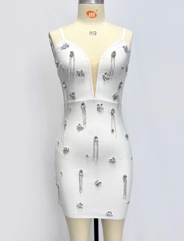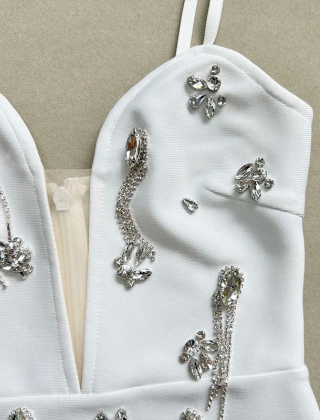 Step into the spotlight with our Spaghetti Strap Diamond V-Neck Mini Dress — a sleek and sparkling statement piece that’s made for glamorous nights out. Designed with a plunging V-neckline and delicate spaghetti straps, this dress features dazzling diamond-like embellishments that catch the light with every move. Its figure-hugging mini silhouette enhances your curves while delivering a luxurious, high-fashion vibe.