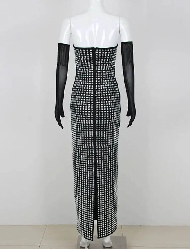 Embrace your inner celebrity with this bodycon dress that hugs your curves in all the right places. The strapless design and v-neck cut add a touch of sultry sophistication, while the diamond detailing adds a dazzling element that will have all eyes on you.