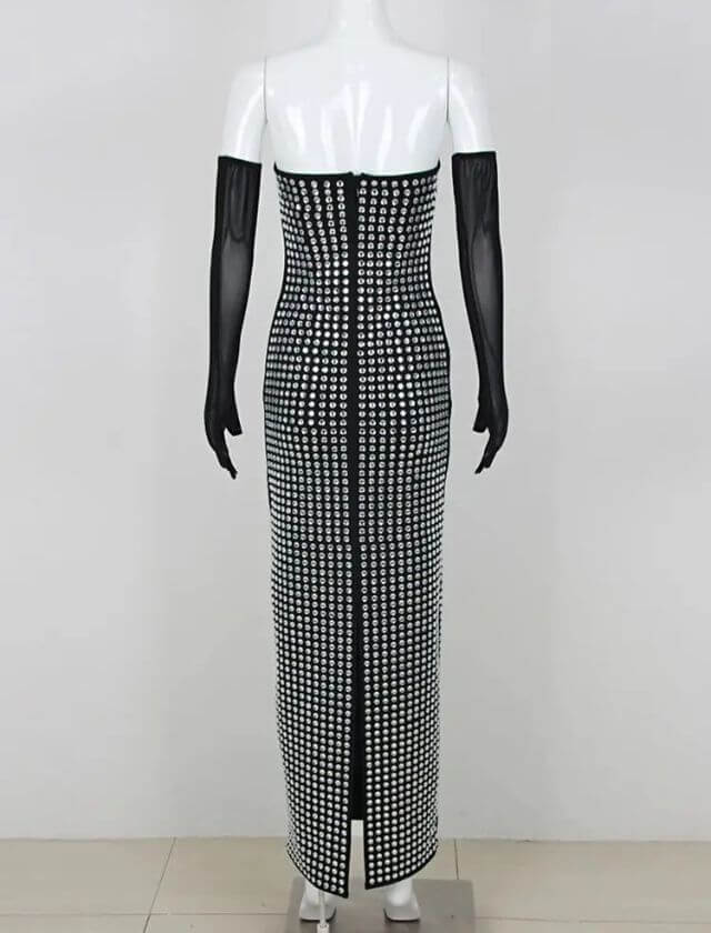 Step into the spotlight and steal the show in our Strapless Diamond Bandage Celebrity Dress With Gloves. This stunning dress is the epitome of glamour and elegance, perfect for making a grand entrance at any event. Slip into this body-hugging, sequin-studded beauty and get ready to turn heads.