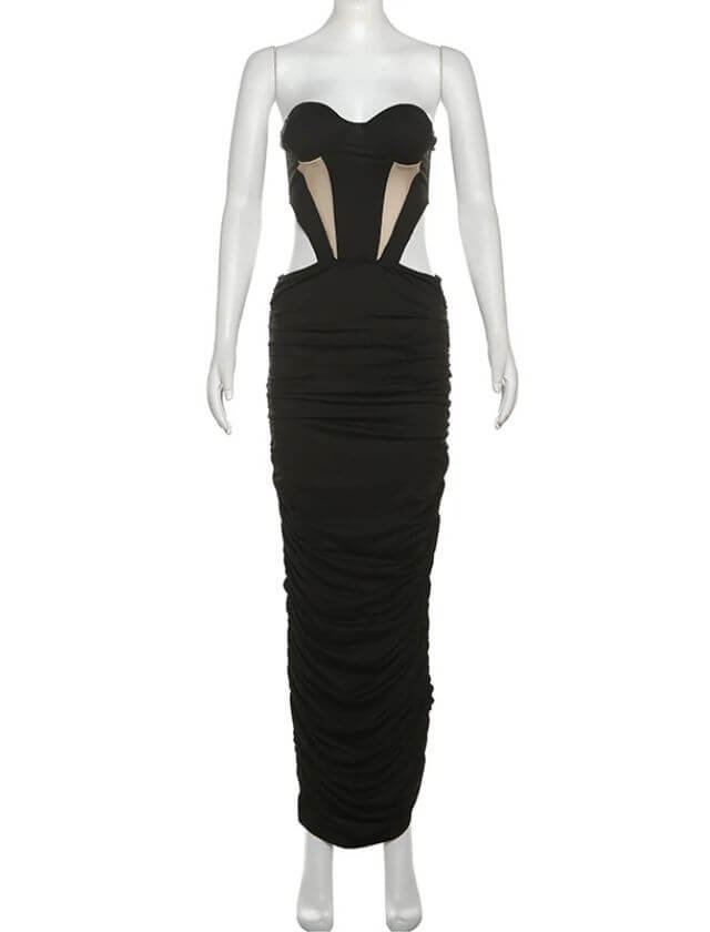 Exude elegance and confidence in our Strapless Ruched Bodycon Black Maxi Dress. Designed with a sleek strapless neckline and figure-hugging ruched detailing, this dress accentuates your curves while offering a timeless, sophisticated silhouette. Its floor-length design ensures a dramatic, glamorous presence for evening events, cocktail parties, or formal occasions.