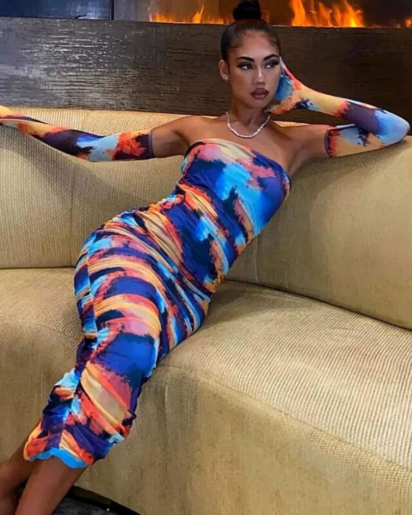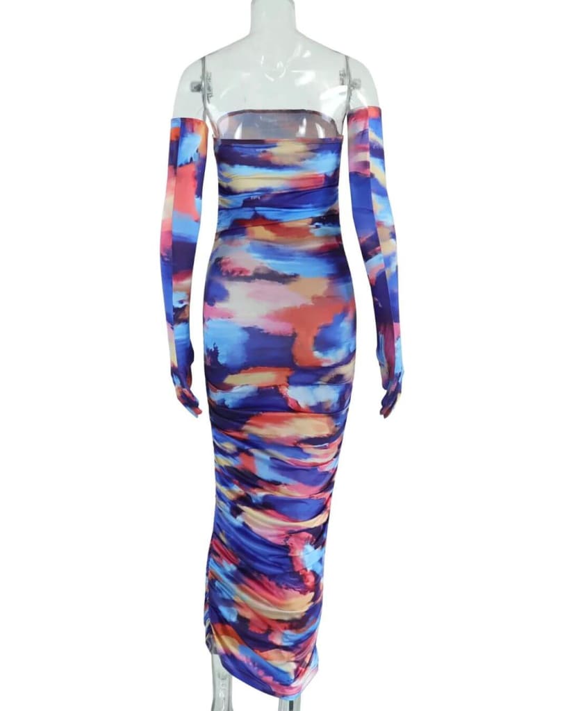 Look trendy and fashionable by wearing the designer tie dye fashion ruched midi dress with gloves sleeves from STYLORD!