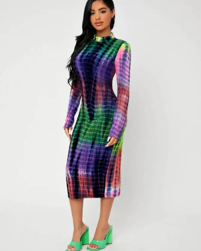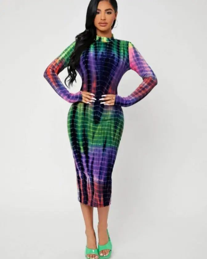 Introducing the Tie Dye Mock Neck Split Back Bodycon Dress, the ultimate fashion statement for confident, trendsetting fashionistas. This dress is perfect for those who love to experiment with new trends and push fashion boundaries while exuding confidence and style.