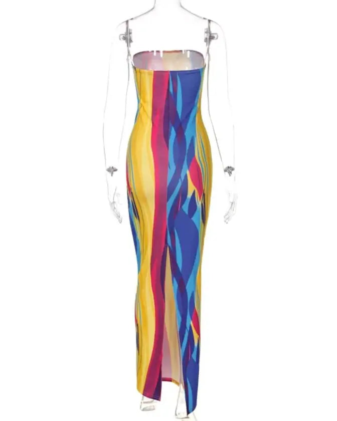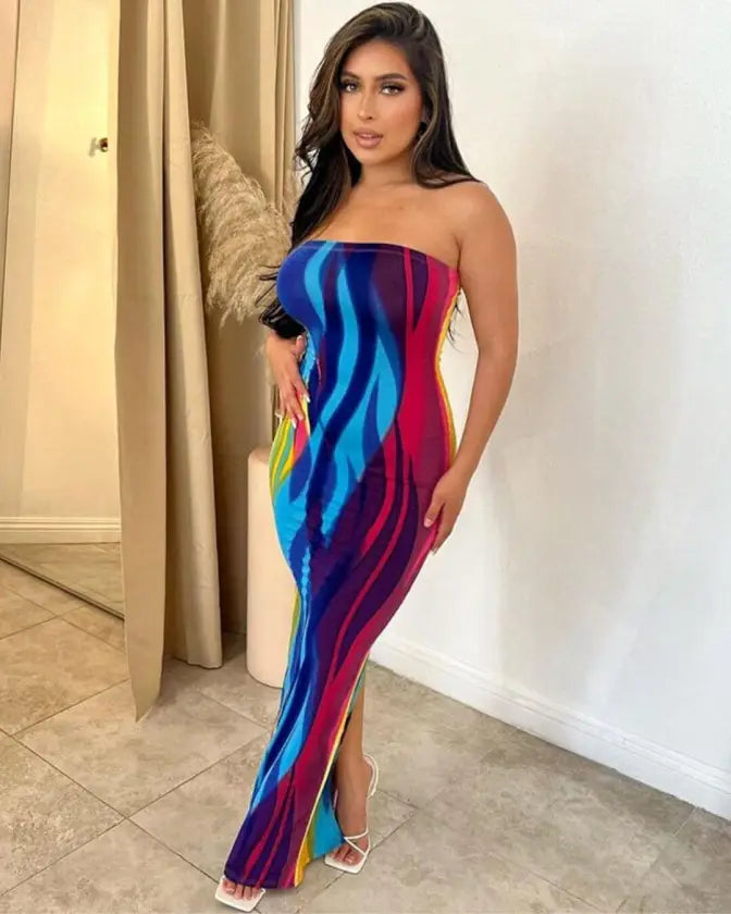Whether you’re strolling along the beach or hitting the summer party scene, our Tie Dye Stripe Print Strapless Bodycon Maxi Dress is the perfect choice for the fashion-forward adventurer in you. This dress isn’t just a piece of fabric; it’s a statement, a celebration of confidence, style, and individuality.