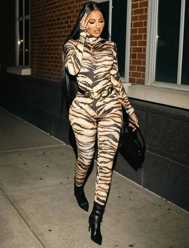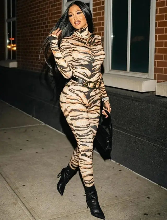 Tiger Print Turtleneck Long Sleeve Jumsuit