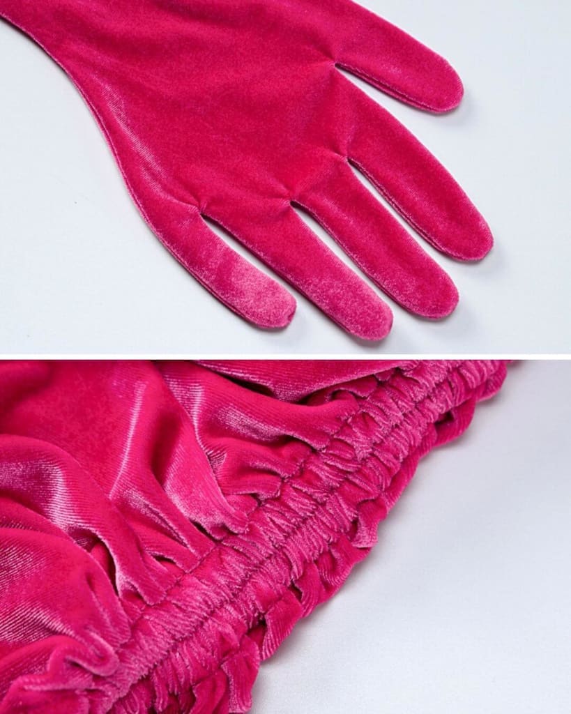 Introducing the Velvet Elegant Solid Rushed Women Mini Dress With Gloves, the fashion-forward statement piece that will elevate your wardrobe to the next level. This dress is the perfect combination of style and comfort and is sure to make you feel like the star that you are.