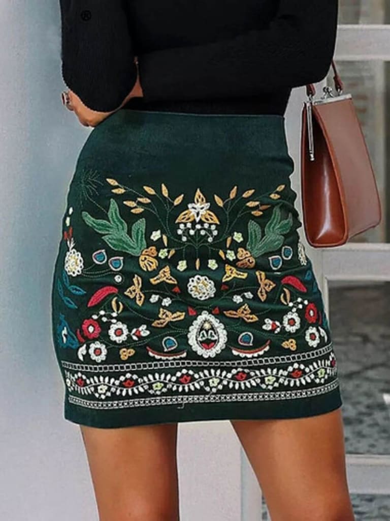 With its sleek and form-fitting design, our vintage embroidery high waist green skirt offers endless layering options and can be styled seamlessly from day to night.