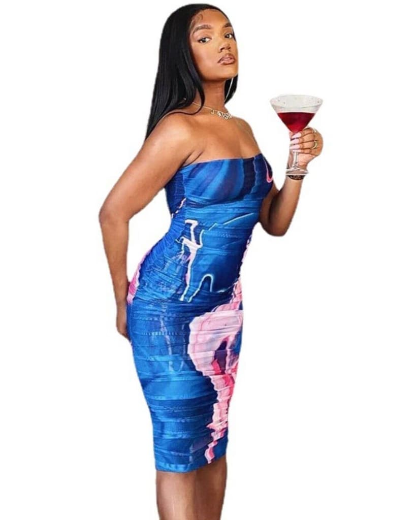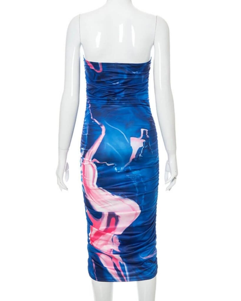 The Water-wave Contrasting Print Strapless Midi Dress is perfect for summer. Tie dye and body-con design combine for a stylish, party-ready look. A ruched waist provides a flattering fit, and it can be worn both casually or for a fun night out. Show off your style with ease!