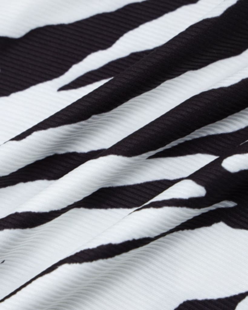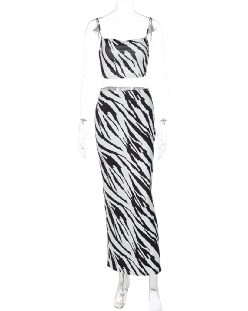he crop top is designed with a delicate spaghetti strap and a v-neckline, giving you a flattering and feminine look. The zebra print is playful and bold, showing off your adventurous side. The maxi skirt is equally impressive, featuring a flowy and lightweight material that dances with every step you take. This two-piece set is perfect for those who want to show off their unique fashion sense. Y